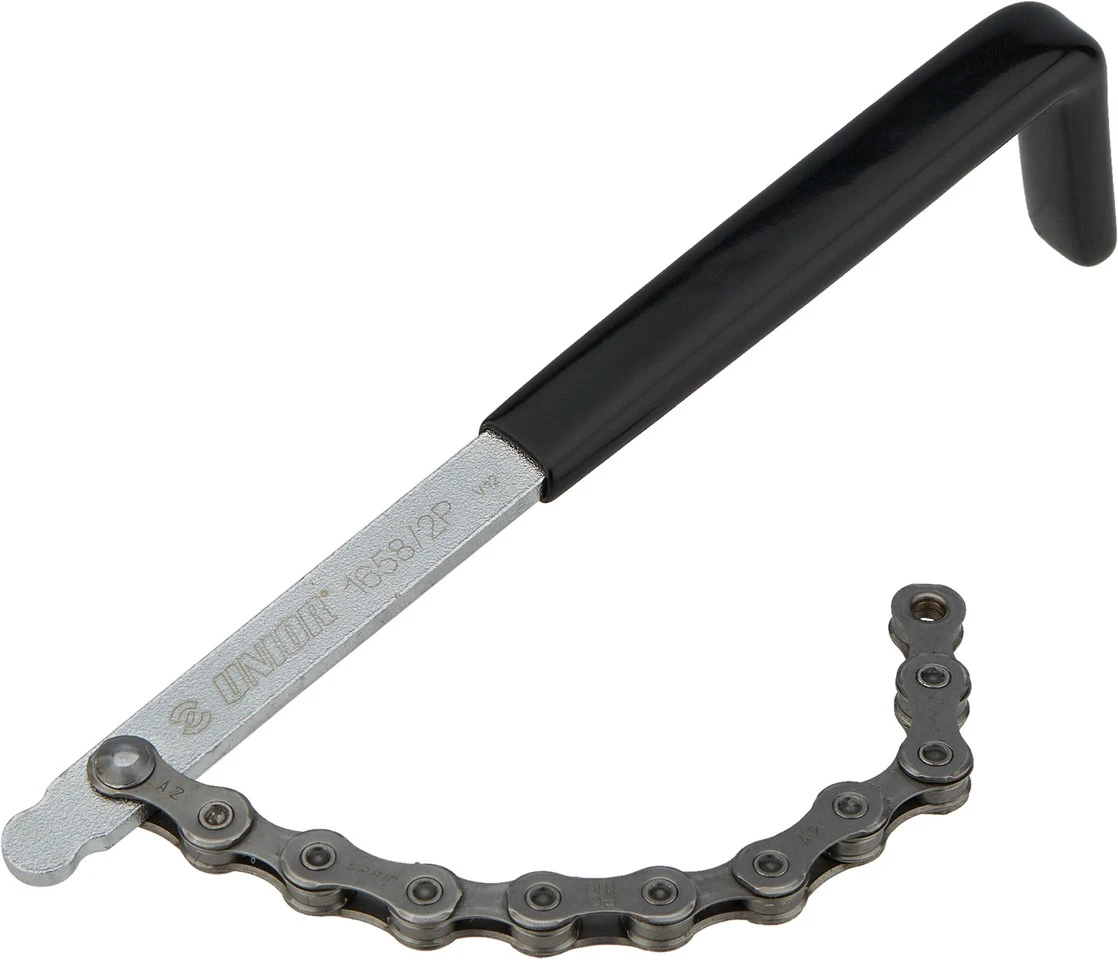 Especificaciones:Función:Control de desgaste de piñonesTipo de herramienta:CalibradorCompatibilidad:Con cassettes Shimano HG e IG, 12 – 21 DDatos técnicos:Material:AceroMaterial del mango:PlásticoCaracterísticas:Control de piñones para HG e IG hasta 21 Dde acero al carbono Premium Flex Pluscromadolongitud total 270 mmUso:Colocar la herramienta sobre el piñón, insertar la palanca con el extremo redondeado entre dos dientesSoltar el último eslabón de la cadena del piñón, presionar la palanca con 10 Nm en el sentido de giro del piñónA continuación, presionar el último eslabón de la cadena en el piñónEl piñón está bien colocado si el último eslabón encaja en el piñón sin problemasEl piñón debe ser sustituido si el último eslabón se atasca o se tiene que ejercer fuerzaEl piñón también debe ser sustituido si la cadena se cae bajo carga