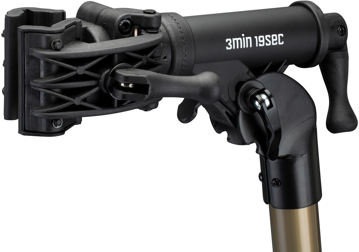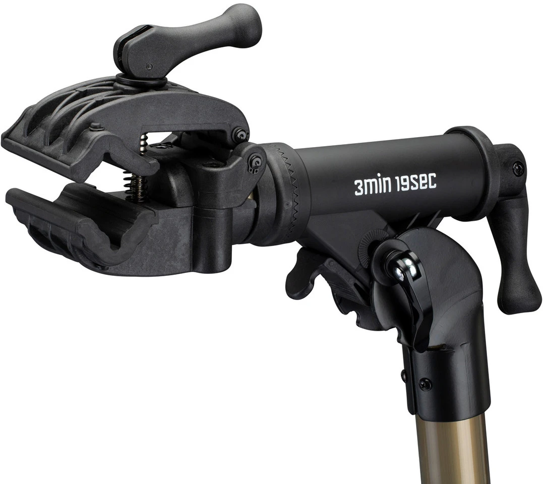 El soporte de montaje de 3min19sec parece bastante sencillo, convence sin embargo con sus características prácticas y su robusta elaboración. Gracias a la garra de manejo intuitivo, puedes colgar la bici en un abrir y cerrar de ojos. Gracias al fino mecanismo de trinquete, la pinza puede girar continuamente en 360°. Las mordazas de la garra protegen la bicicleta y/o el cuadro para que no se produzcan arañazos. Debido a su robusta construcción, se pueden colgar bicicletas de hasta 25 kg. El portabicicletas del taller se puede plegar en un abrir y cerrar de ojos para facilitar el transporte o el almacenamiento.